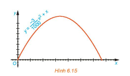 6.14. Quỹ đạo của một vật được ném lên từ gốc $O$ (được chọn là điểm ném) trong mặt phẳng tọa độ $Oxy$ là một parabol có phương trình $y = \frac{-3}{1000}x^2 + x$, trong đó $x$ (mét) là khoảng cách theo phương ngang trên mặt đất từ vị trí của vật đến gốc $O$, $y$ (mét) là độ cao của vật so với mặt đất (H.6.15).