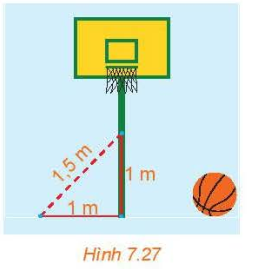 7.9. Một cột bóng rổ được dựng trên một sân phẳng. Bạn Hùng đo khoảng cách từ một điểm trên sân, cách chân cột 1 m đến một điểm trên cột, cách chân cột 1 m được kết quả là 1,5 m (H.7.27). Nếu phép đo của Hùng là chính xác thì cột có vuông góc với sân hay không? Có thể kết luận rằng cột không có phương thẳng đứng hay không?