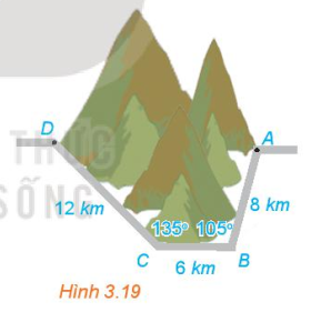 3.11. Để tránh núi, đường giao thông hiện tại phải đi vòng như mô hình trong Hình 3.19. Để rút ngắn khoảng cách và tránh sạt lở núi, người ta dự định làm đường hầm xuyên núi, nối thẳng từ $A$ tới $D$. Hỏi độ dài đường mới sẽ giảm bao nhiêu kilômét so với đường cũ?