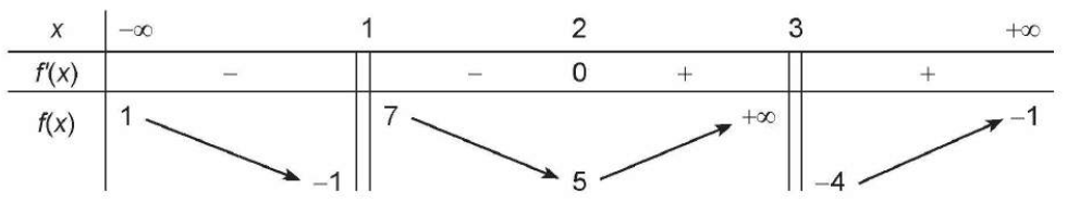 1.37. Cho hàm số $y = f(x)$ xác định trên $\mathbb{R} \setminus \{1; 3\}$, liên tục trên mỗi khoảng xác định và có bảng biến thiên như sau: