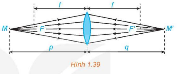 1.44. Xét một thấu kính hội tụ có tiêu cự $f$ (H.1.39). Khoảng cách $p$ từ vật đến thấu kính liên hệ với khoảng cách $q$ từ ảnh đến thấu kính bởi hệ thức: