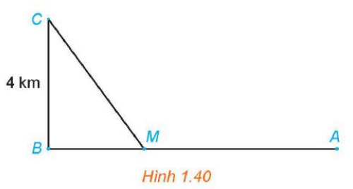 1.46. Một đường dây điện được nối từ một nhà máy điện ở $A$ đến một hòn đảo ở $C$ như Hình 1.40. Khoảng cách từ $C$ đến $B$ là 4 km. Bờ biển chạy thẳng từ $A$ đến $B$ với khoảng cách là 10 km. Tổng chi phí lắp đặt cho 1 km dây điện trên biển là 50 triệu đồng, còn trên đất liền là 30 triệu đồng. Xác định vị trí điểm $M$ trên đoạn $AB$ (điểm nối dây từ đất liền ra đảo) để tổng chi phí lắp đặt là nhỏ nhất.