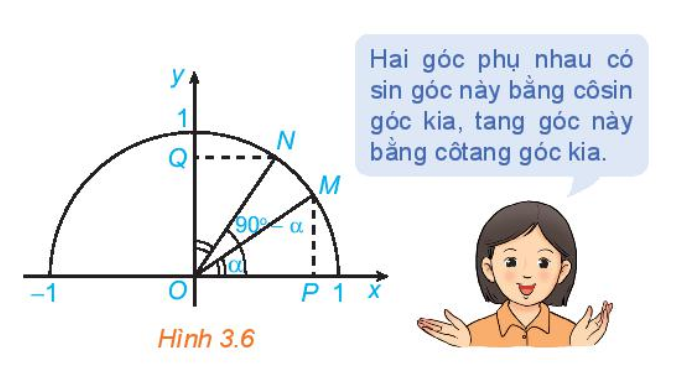 Trong Hình 3.6, hai điểm $M, N$ ứng với hai góc phụ nhau $\alpha$ và $90^\circ – \alpha$ ($\widehat{xOM} = \alpha$, $\widehat{xON} = 90^\circ – \alpha$).