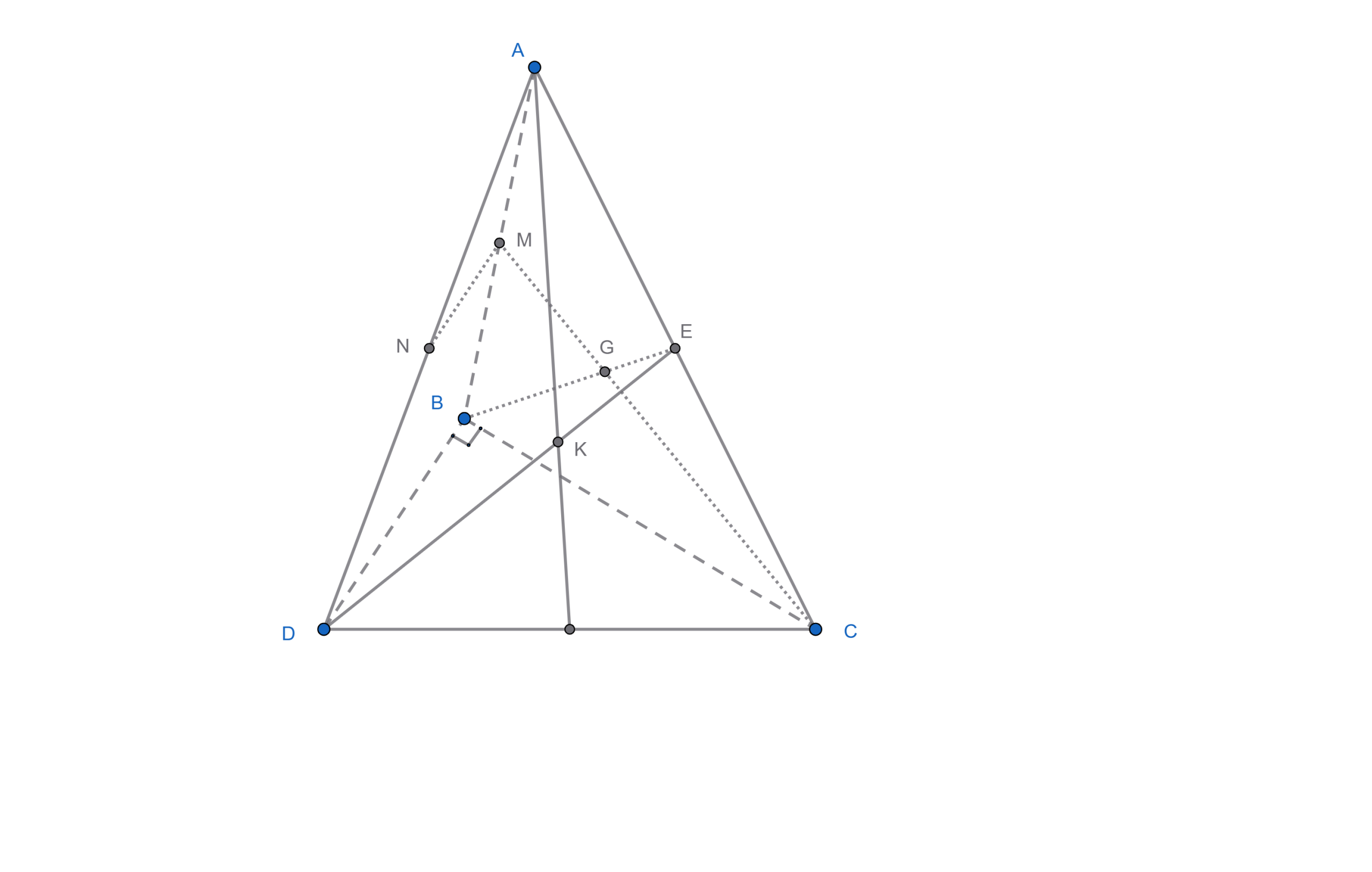 Tương tự, xét $\triangle ACD$, vì $K$ là trọng tâm và $DE$ là đường trung tuyến xuất phát từ $D$ nên điểm $K$ nằm trên đoạn $DE$ và ta có tỉ số: